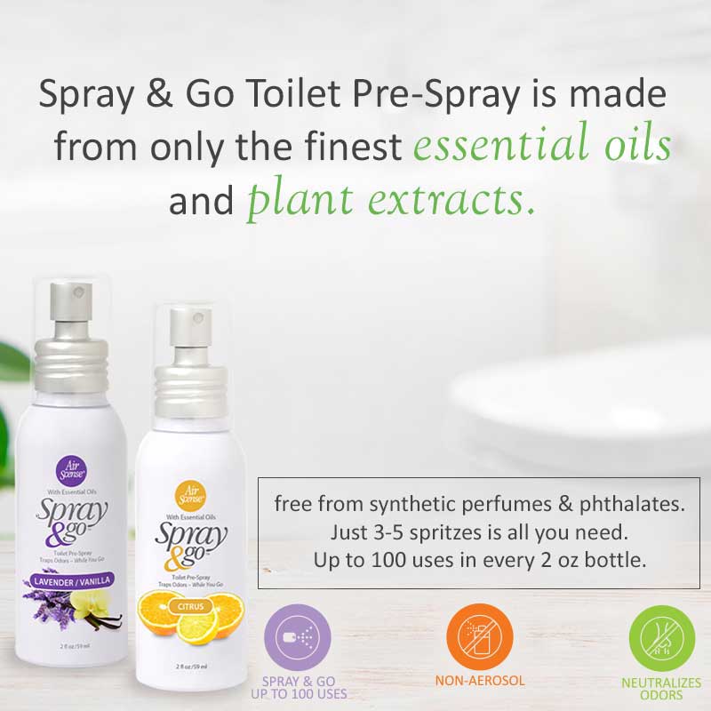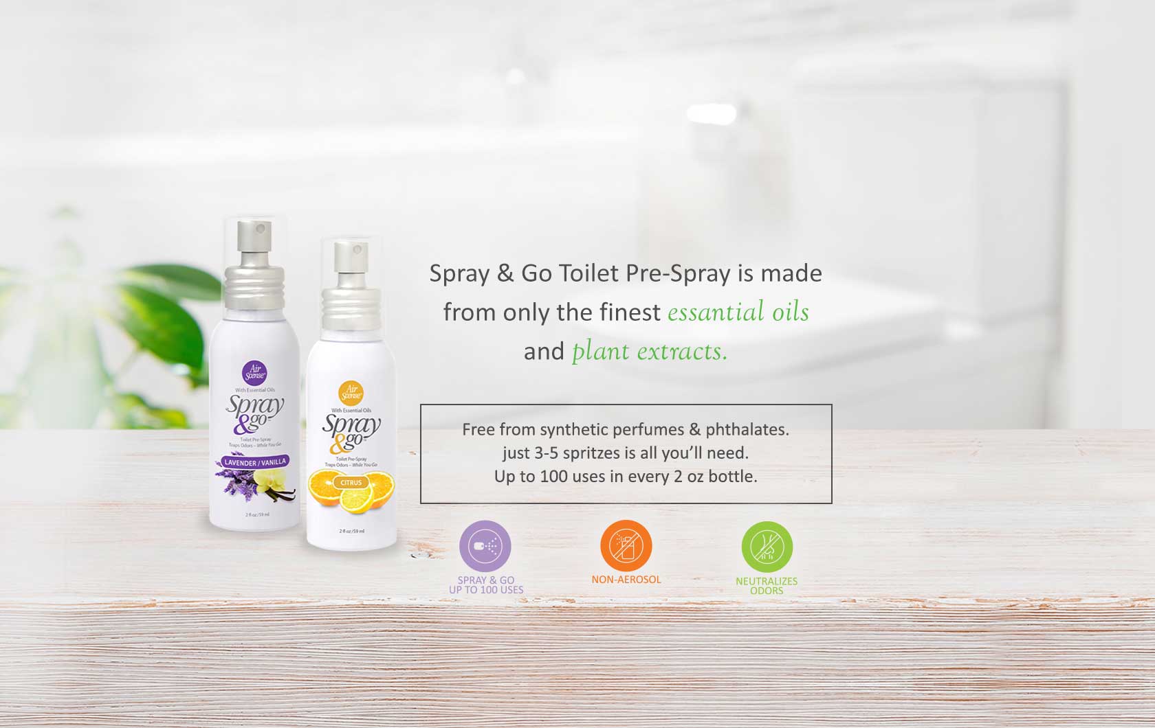 When nature calls, go ahead and answer. With Spray & Go toilet spray, a few spritzes before you sit will block embarrassing odor and refresh the air. Like our air fresheners, Spray & Go is made from the finest essential oils and plant extracts—and never any harmful phthalates. Each 2-ounce, non-aerosol, pump-spray aluminum bottle looks right at home in any bathroom—and is discreet enough to tuck in a purse, gym bag or even office drawer. Plus, every bottle contains 100 uses, so it’ll keep “going” for a long time.